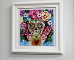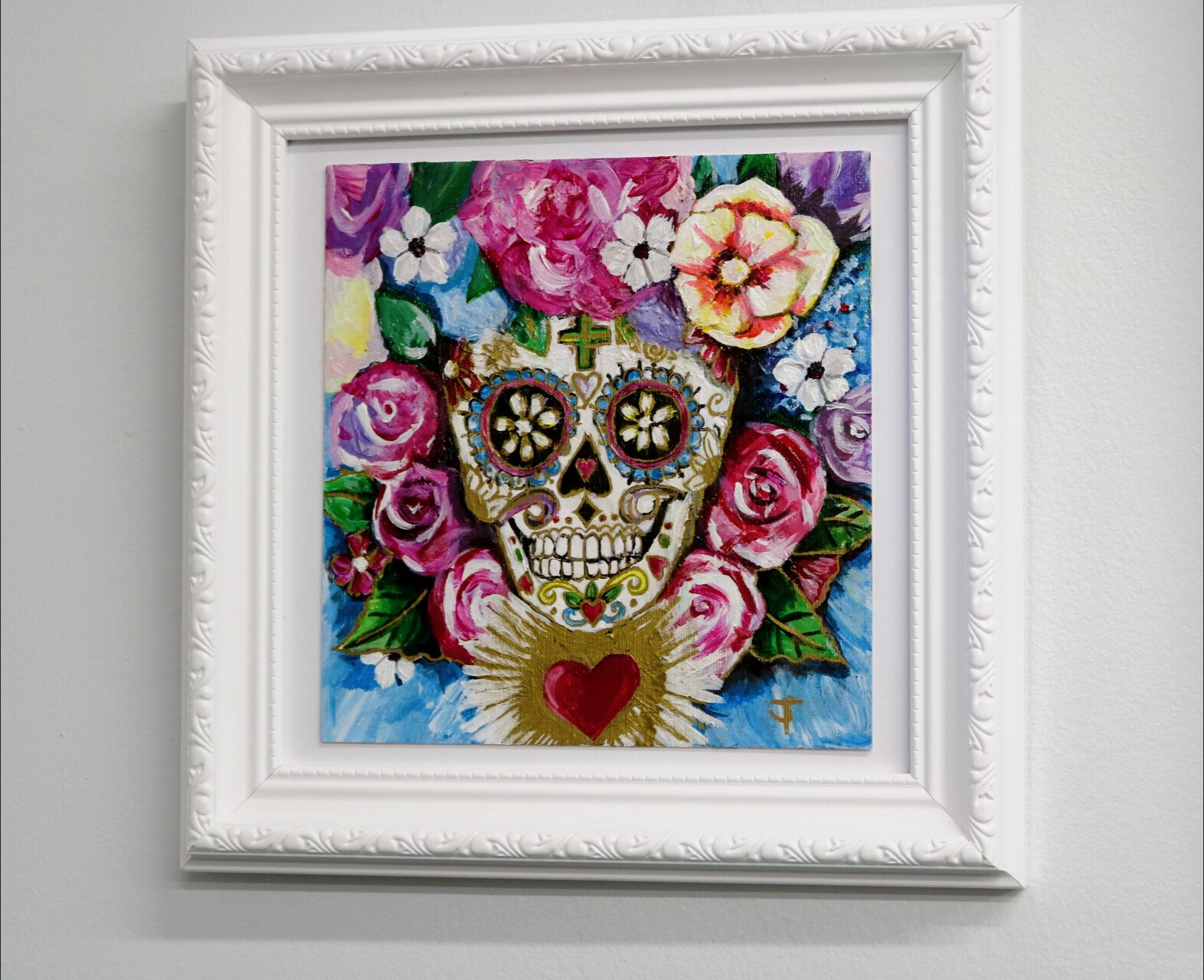 Mexican Skull is an original acrylic painting that blends the rich visual language of Día de los Muertos with your signature gothic romantic style. At its centre sits an ornate sugar skull, adorned with intricate floral motifs, sacred iconography, and radiant detailing that brings a sense of life, memory, and reverence to the piece. Surrounding it, a lush arrangement of vibrant blooms creates a striking contrast between mortality and beauty, a reminder that even in darkness, colour thrives.