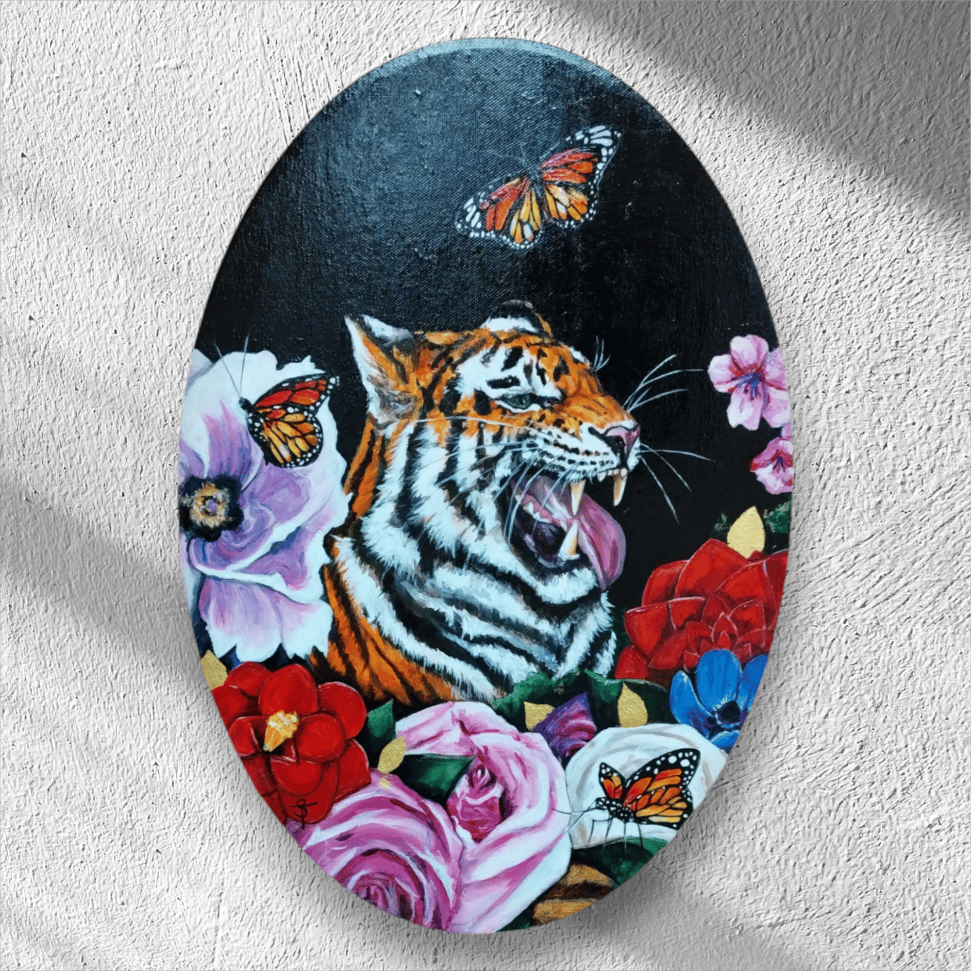 Original painting, acrylic and 24ct gold leaf on oval canvas panel.